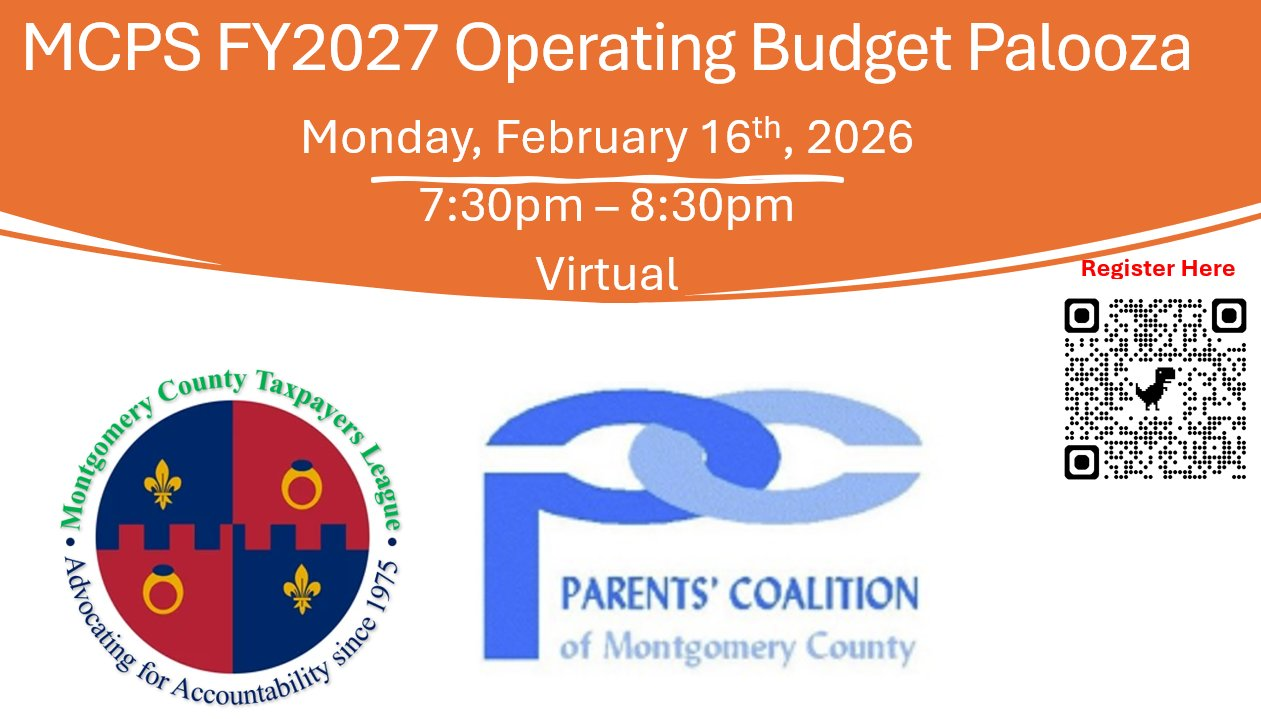 MCTL is Co-Sponsoring the annual MCPS Budget Palooza with the Parents’ Coalition of Montgomery County. We will do a deep dive into the $3,775,269,535 MCPS FY2027 Operating Budget on Monday, February 16th, 2026 at 7:30pm.