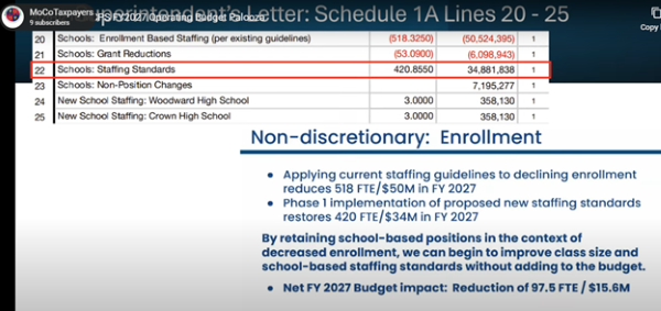 - In Superintendent Taylor’s letter (below), he indicated that MCPS had cut 50 Full Time Employees (FTE) but it did not show that they had added 65 FTEs in other places. Therefore, they did not actually cut $11 Million.