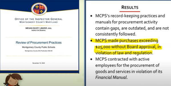 - The Montgomery County Office of the Inspector General reported: “MCPS made purchases exceeding $25,000 without Board approval, in violation of law and regulation.”