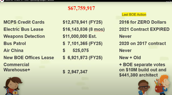 - Electric bus lease: $16 Million was spent in FY26 but the Board of Education has not discussed this lease since 2021! The contract has since expired and has been determined to be illegal by the Maryland State Board of Education.
