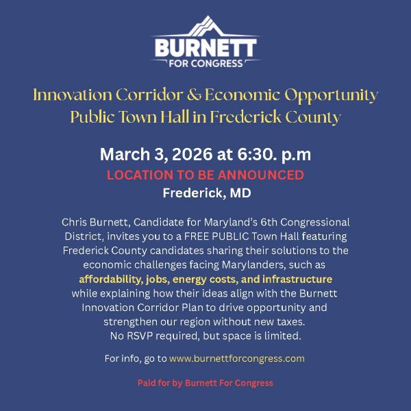 Please join us for the upcoming Innovation Corridor & Economic Town Hall hosted by Chris Burnett, Candidate for Maryland’s 6th Congressional District. This event will feature local Frederick County candidates and will be held on March 3, 2026 at 6:30 p.m. Below is the announcement with details of the event. Location will be announced by Wednesday, February 25th.