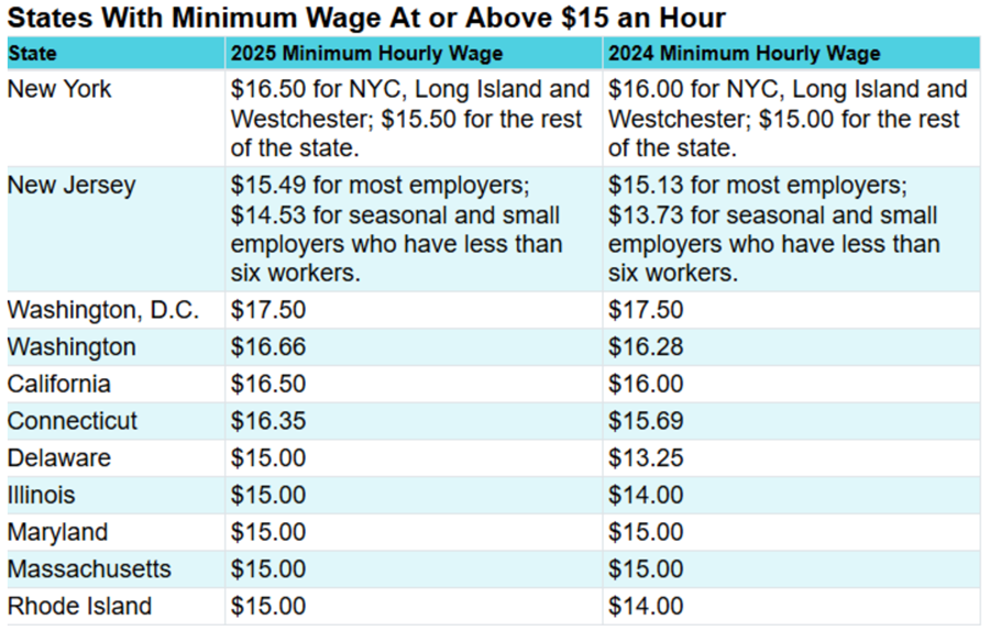 11 states with $15 minimum wage also raised the rate even higher, except Maryland which raised their minimum wage to $15 as of January 1, 2025.